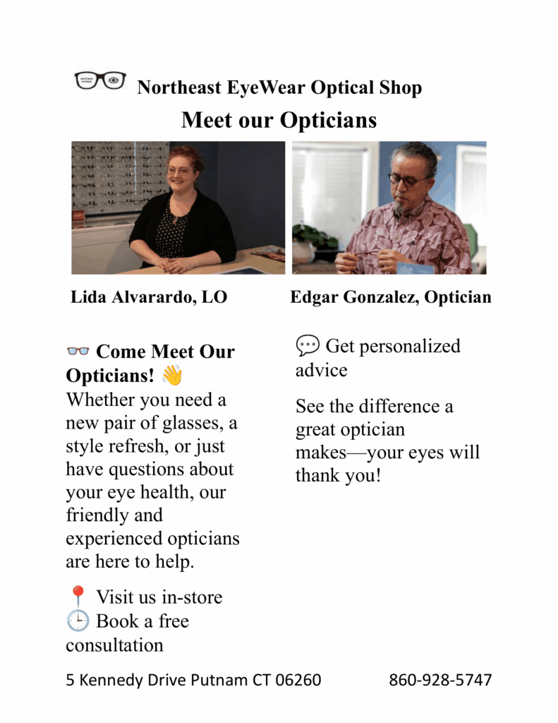 Welcome to Eye care Northeast in Putman, Connecticut. Our mission at Eye Care Northeast is to serve the total needs of our patients who entrust us with their vision care. We dedicate ourselves to enhancing the quality of life for each and every patient we encounter. We will do this with respect and dignity. At our clinic, your vision isn't just a number on a chart; it's a unique and essential part of your life that deserves our utmost care and consideration.